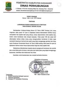 “Surat edaran tersebut sebagai bagian dari penertiban parkir di sepanjang Jalan Tuparev. Tidak boleh ada kendaraan R2 dan R4 yang parkir di atas trotoar,” ujarnya saat dikonfirmasi reporter kanalkarawang.com melalui pesan WhatsApp, Rabu (24/9/2025)